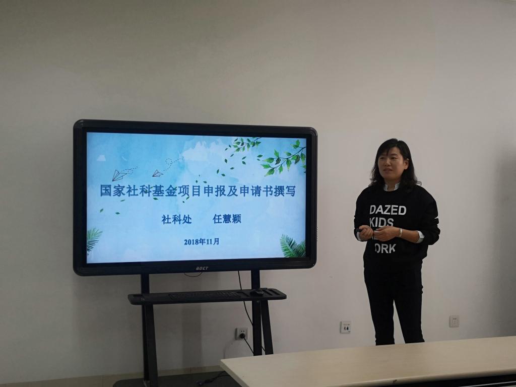 陈功香副院长首先向任慧颖处长介绍了目前学院的基本科研情况,并对此次项目研讨会做了基本部署。任慧颖处长对我院近几年在科研项目申报中获得的突出成绩表示肯定,并针对我院2019年拟申请项目选题进行了指导。任处长向我院老师发放了《2018年度国家社会科学基金项目立项课题论证活页汇编》,表达了学校社科处对我院科研工作的大力支持,并做了《国家社科基金项目申报及申请书撰写》的报告。会议最后,各位拟申请项目老师汇报了目前项目写作进展以及存在的问题,任处长给予了针对性的指导和建议。经过此次研讨会,各位申报项目老师进一步明晰了项目书目前存在的问题和要改进的方向。