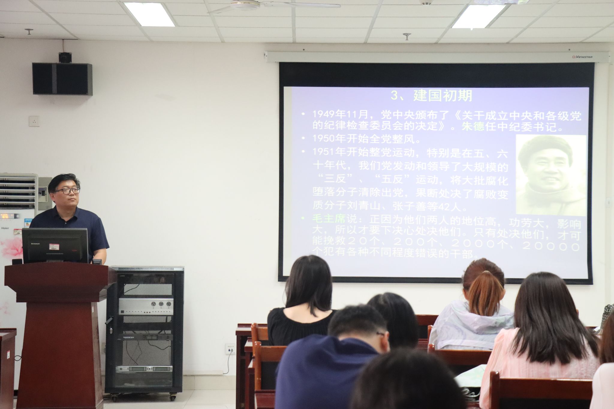 611日下午,教育与心理科学学院在特教楼A302举办党纪学习教育专题党课。专题党课由学院党委书记季竹君主讲,学院全体教工党员参加。