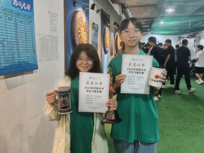 比赛现场气氛热烈,选手们精神抖擞、跃跃欲试。他们手持飞镖,眼神专注而坚定,每一次投掷都凝聚着技巧与策略。随着飞镖在空中划过一道道优美的弧线,现场观众时而欢呼雀跃,时而安静紧张,情绪被选手们的精彩表现所牵动。在激烈的竞争中,选手们充分发挥各自的实力,展现出了精湛的技艺和顽强的拼搏精神。经过数轮紧张的角逐,我院的李欣和袁心瑜同学凭借稳定的发挥和出色的技巧,分别夺得本次比赛女子组的冠亚军,我院的其他参赛选手同样在比赛中展现了卓越的水平,并荣获了优秀组织奖。