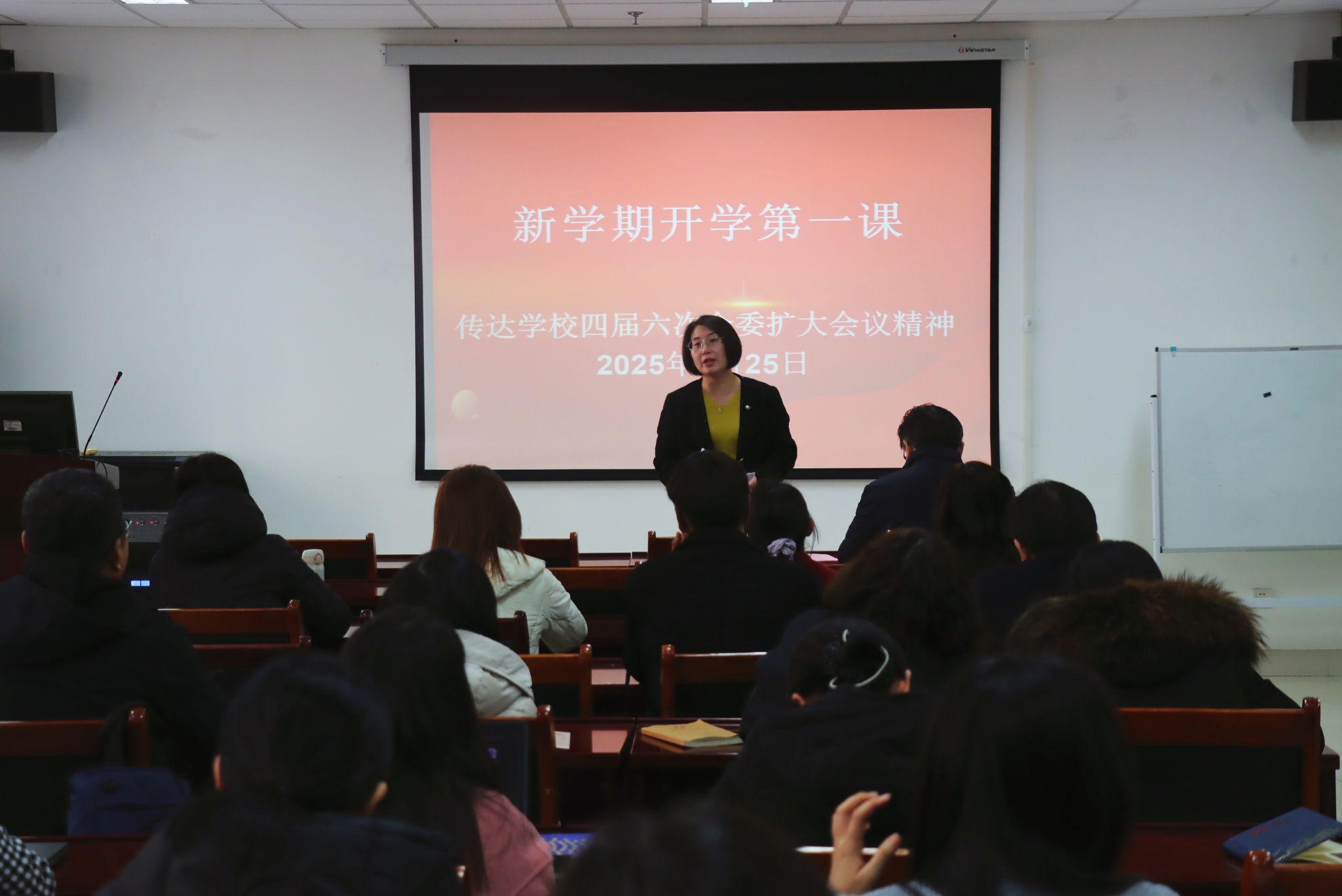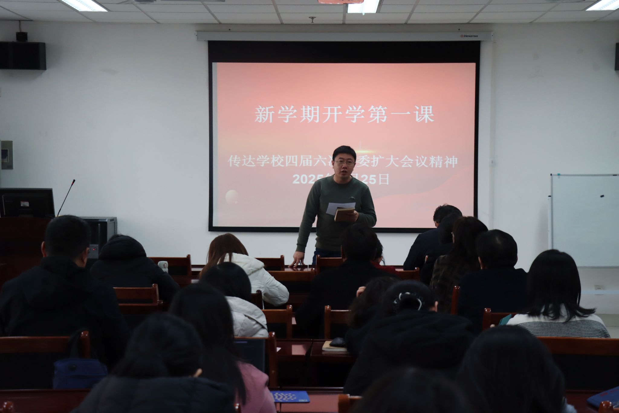 2月25日,365英国上市公司在线召开全体教职工“开学第一课”,传达学习济南大学四届六次全委扩大会议精神。学院党委书记季竹君主持会议并讲话,全体教职工参加会议。