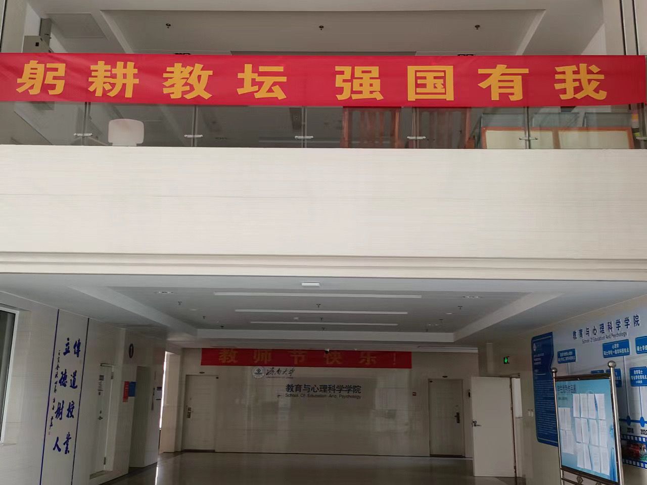 为庆祝第39个教师节,学院在教师节到来之前,在学院一楼悬挂“躬耕教坛,强国有我”和“教师节快乐”两个横幅,在全院弘扬尊师重教风尚,做好师德师风建设。全体教职工将志存高远、严谨笃学、勇于创新、奋发进取,为学校、学院的教育事业做出应尽贡献!