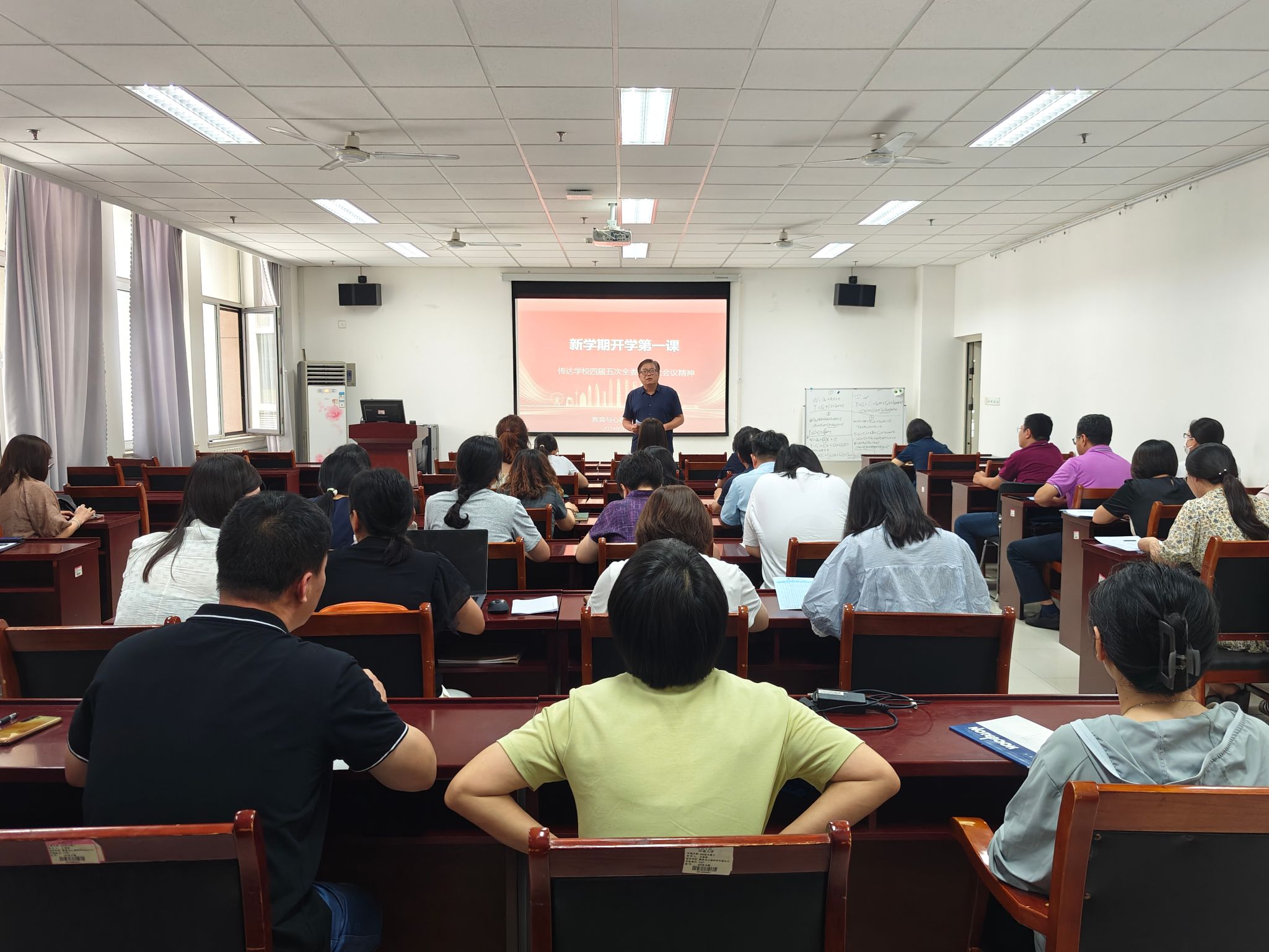 院长陈功香传达了学校党委副书记、校长刘宗明在学校四届五次全委会扩大会议上的讲话精神。着重部署了新学期学院的重点工作。围绕博士点申报,学院将推行学科振兴计划,做高效的有组织的科研。学院要紧跟学校发展的战略方向,积极谋划学院高质量发展的路径和实施办法,提升学院人才培养质量和学科发展水平,提升社会服务水平。