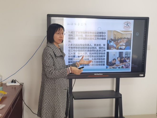 陈晓洁教授立足于文学院师范专业认证过程中积累的丰富经验,对申报、认证工作的流程、着力点、注意事项、第三方调研单位的选择、师范文化建设、自评报告撰写的工作分配等方面给出了详细的建议。陈教授的报告帮助我院梳理了师范专业认证工作的流程、工作量、重点、难点,使得我院在申报认证过程中尽量少走弯路。