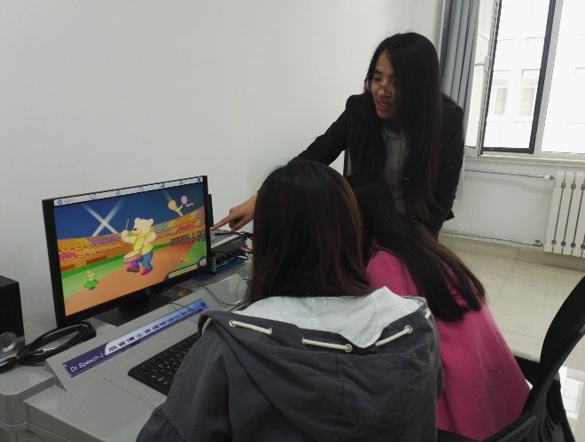 言语康复室是集教、学、做一体化的实验室,主要开展言语呼吸、发声、共鸣、构音、语音等项目的实时测量与治疗。通过教师示范、学生探索、小组讨论等形式,模拟实践特殊儿童言语能力的测量与训练技术,达到理论与实践的融合,同时,拟将为科研与社会服务提供重要的场所。承担《特殊儿童言语治疗》《听力障碍儿童的心理与教育》《智力障碍儿童的心理与教育》《自闭症儿童的干预》等一系列课程教学活动。主要设备包括发声诱导仪 Dr.Speech-2、语音评估与训练仪 Dr.Speech-3和早期语言评估与干预仪 Dr.Language-4。