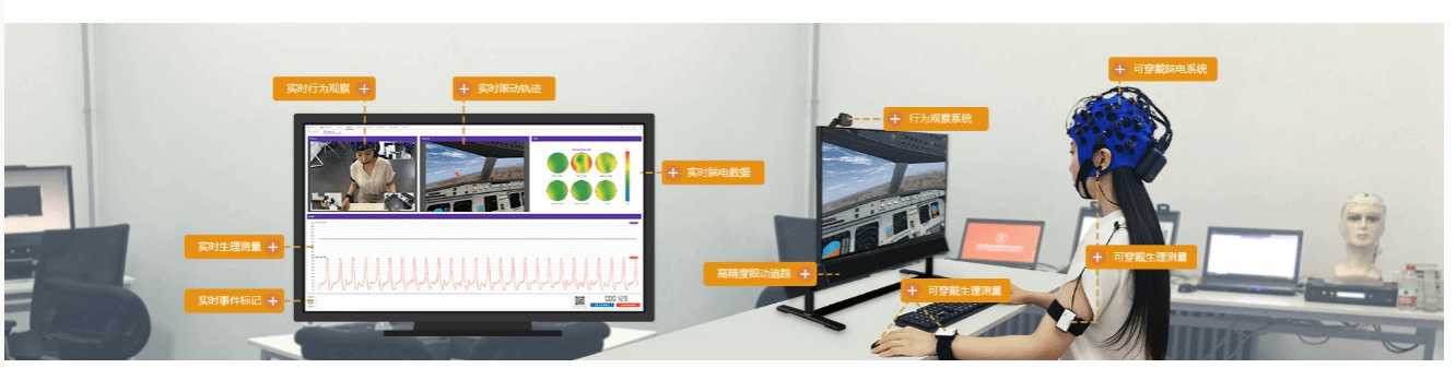 多导生理仪又称作多通道生理信号记录分析仪 (Polygraph),其测量的是人类中枢神经系统以及外周神经系统的各项生理指标。研究人员通过选配放大器及相应传感器,可完成以下生理信号测量:心电、肌电、皮肤电阻、眼电、无创血压、体温、呼吸流速、组织血流、氧气和二氧化碳含量、血氧饱和度、无创心输出量、光电脉搏容积等。该技术所采集的数据分析手段多样,广泛运用在心理学、脑与认知科学等交叉科学领域。本实验室主要利用该技术考查个体的注意、视听感觉、知觉、情绪、意志基础和高级认知过程在自然和实验情境下的特定表征及机制,并可与其他各类认知神经多模态数据进行融合,提供可靠的生理信息,并对后续的心理健康干预手段提供清晰可控的反馈及可精确量化的生理指标。